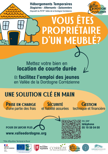 Pourquoi participer ?Offrir une solution de logement à de jeunes actifs aux revenus limités. Aider les employeurs locaux à recruter et fidéliser leurs équipes Valoriser votre bien en toiute tranquilité. Comment ça marche ?1 - Vous contactez le PETR par téléphone, ou en compléter le formulaire de contact. 05 19 59 04 00Formulaire de contact 2 - Notre prestataire vous rencontre, référence votre logement, gère ses disponiblités et sa mise en location 3 - Il gère l'ensemble des démarches : contact, entrée/sortie, suivi Vos avantagesSouplesse : location courte durée, de la semaine à plusieurs mois selon vos souhaits. Vous gardez la disponibilité de votre bien selon vos besoins Sérénité : notre partenaire s'occupe de tout (dossier, solvabilité, gestion locative.). Le PETR, grâce à ses prestataires, prend en charge la promotion et toutes les démarches administratives de l'état des lieux à la remise des clés. Soutien : le PETR, grâce à ses soutiens financiers, prend en charge les frais de mise en location. |