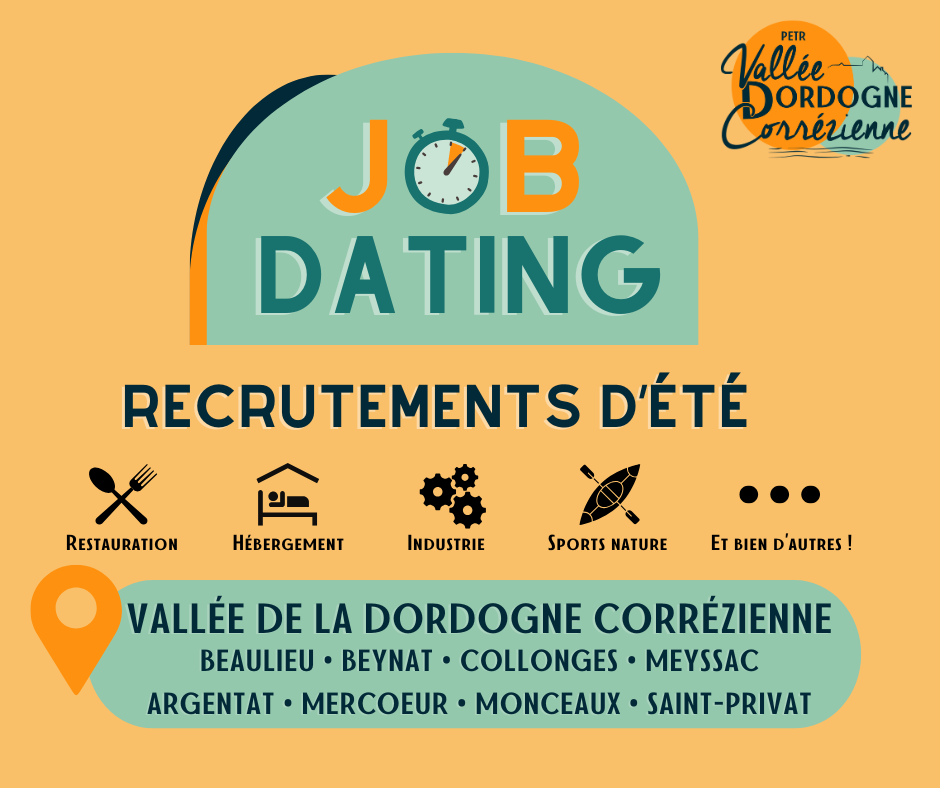 Les Job Dating 2025 auront lieu les après-midis, à partir de 14h30 - à Meyssac, salle de Versailles le mardi 7 avril - à Argentat, salle des Confluences le jeudi 9 avril |